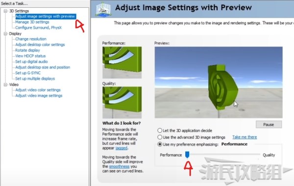 打开NVIDIA控制面板,在【通过预览调整图像设置】一项下,找到【使用我的优先选择-侧重于】,将滑块拖动至【性能】,点击应用。