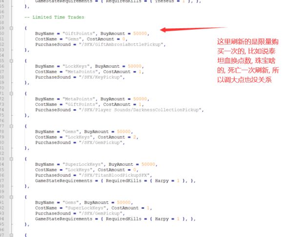 又尝试了修改商店里的货物价格,地址是在ConsumableData.lua,第1089行开始,BaseValue属性,修改成1,就可以1块钱购买商店恩赐了,如果想初始生命值提高的话,修改HeroData.lua,第六行,MaxHealth = 50,属性,这个就是你初始生命值了,如果觉得本身容易死的话,调大一点就不容易死了。